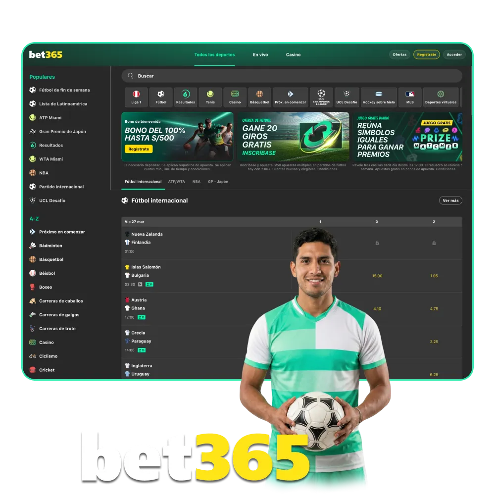 Bet365 Perú tiene una sección especial para apuestas deportivas, con cientos de mercados en tiempo real, cuotas competitivas y transmisiones en vivo. Los usuarios pueden apostar en más de 30 deportes y descubrir nuevas oportunidades de juego de forma legal.